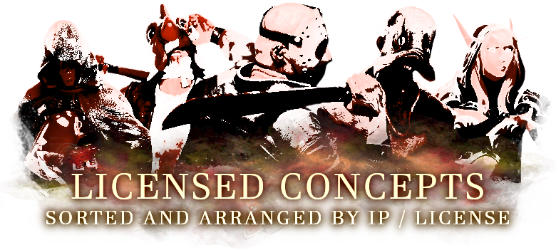 Sorted by IP / License the character(s) and/or concept is based on and arranged alphabetically in columns, excluding Retired concepts.