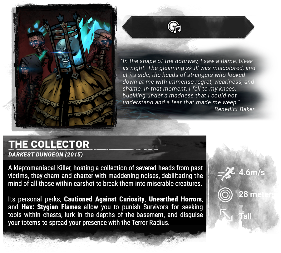Early drafts of The Star's power were going to deal with semi-permanent wounds that could be applied while a Survivor is in the Dying State, but applying and making it useful felt clunky and slow, so the design was redone to fit a more natural "top down" design with the idea and visual of a performance occurring and using lullaby as a game mechanic outside of a warning.