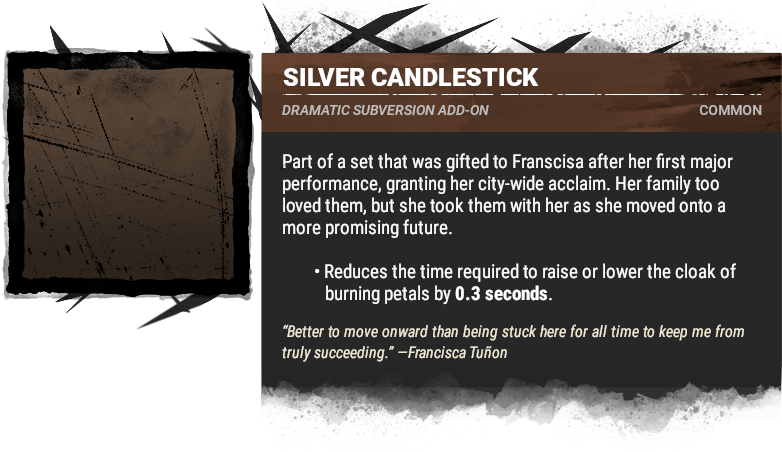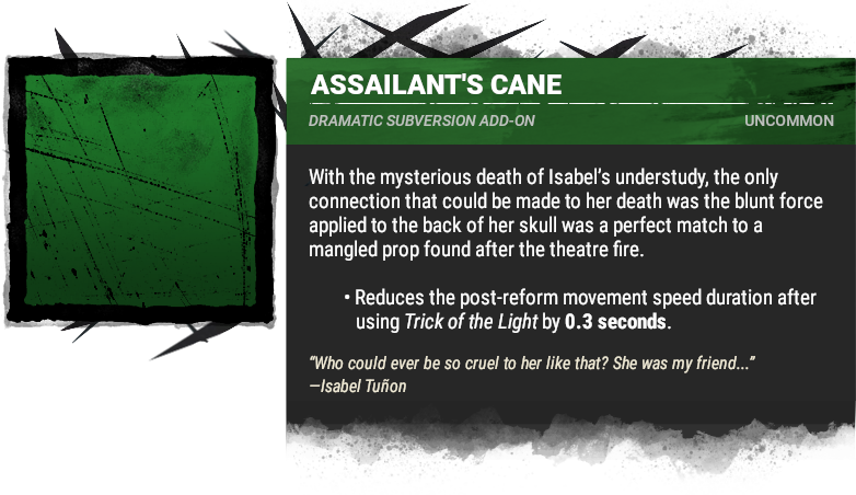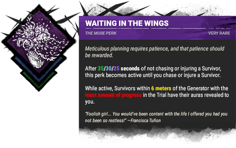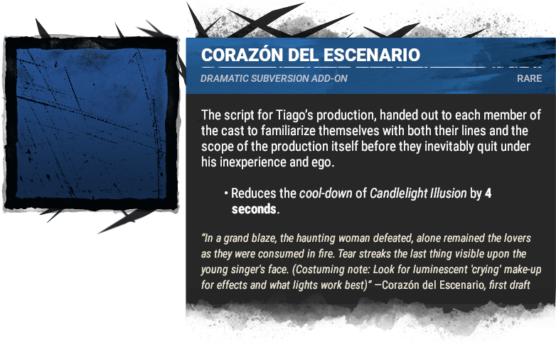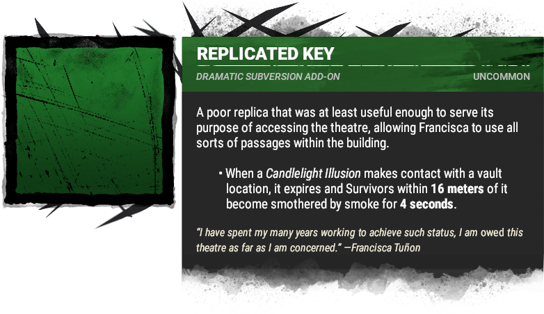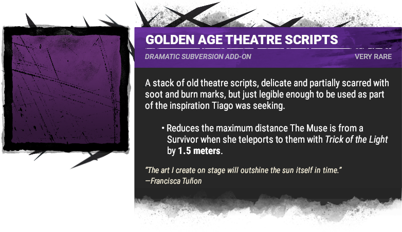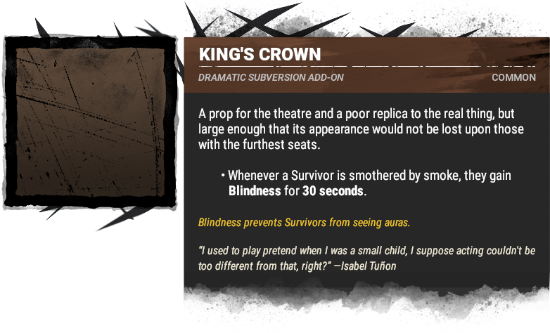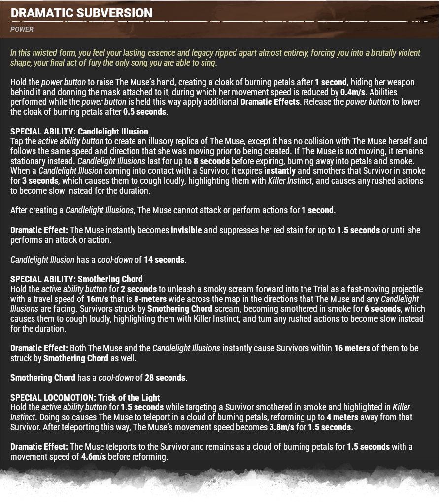 Early drafts of The Star's power were going to deal with semi-permanent wounds that could be applied while a Survivor is in the Dying State, but applying and making it useful felt clunky and slow, so the design was redone to fit a more natural "top down" design with the idea and visual of a performance occurring and using lullaby as a game mechanic outside of a warning.