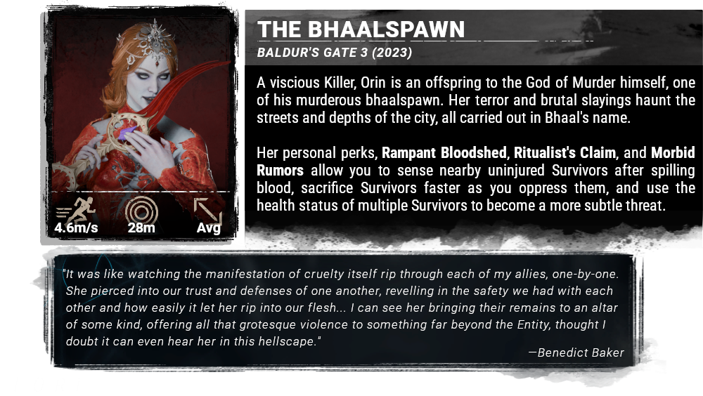 My work with the Dead by Daylight Community Concept Team was collaborative and as much as I'd like to do spotlight videos again, they were very time consuming and ultimately the core members of the team had more priorities that needed to be dealt with. Maybe someday again, but it's not likely as life got in the way. For those who might speculate, we all still very much are friends and I'd be happy to work with them again.